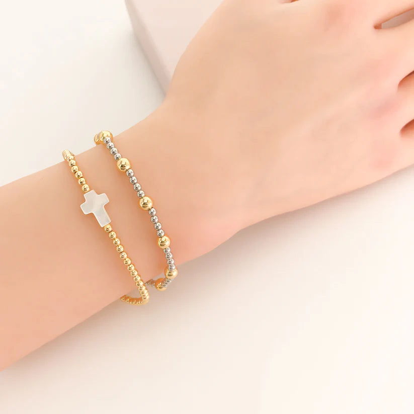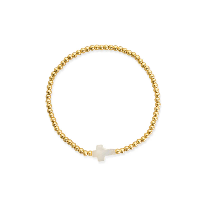This stretch bracelet is a must-have for any jewelry lover. Featuring an eye-catching Mother of Pearl cross and beautifully beaded design, it adds the perfect touch of charm to any outfit. Easy to wear and comfortable, this bracelet will quickly become your go-to accessory.