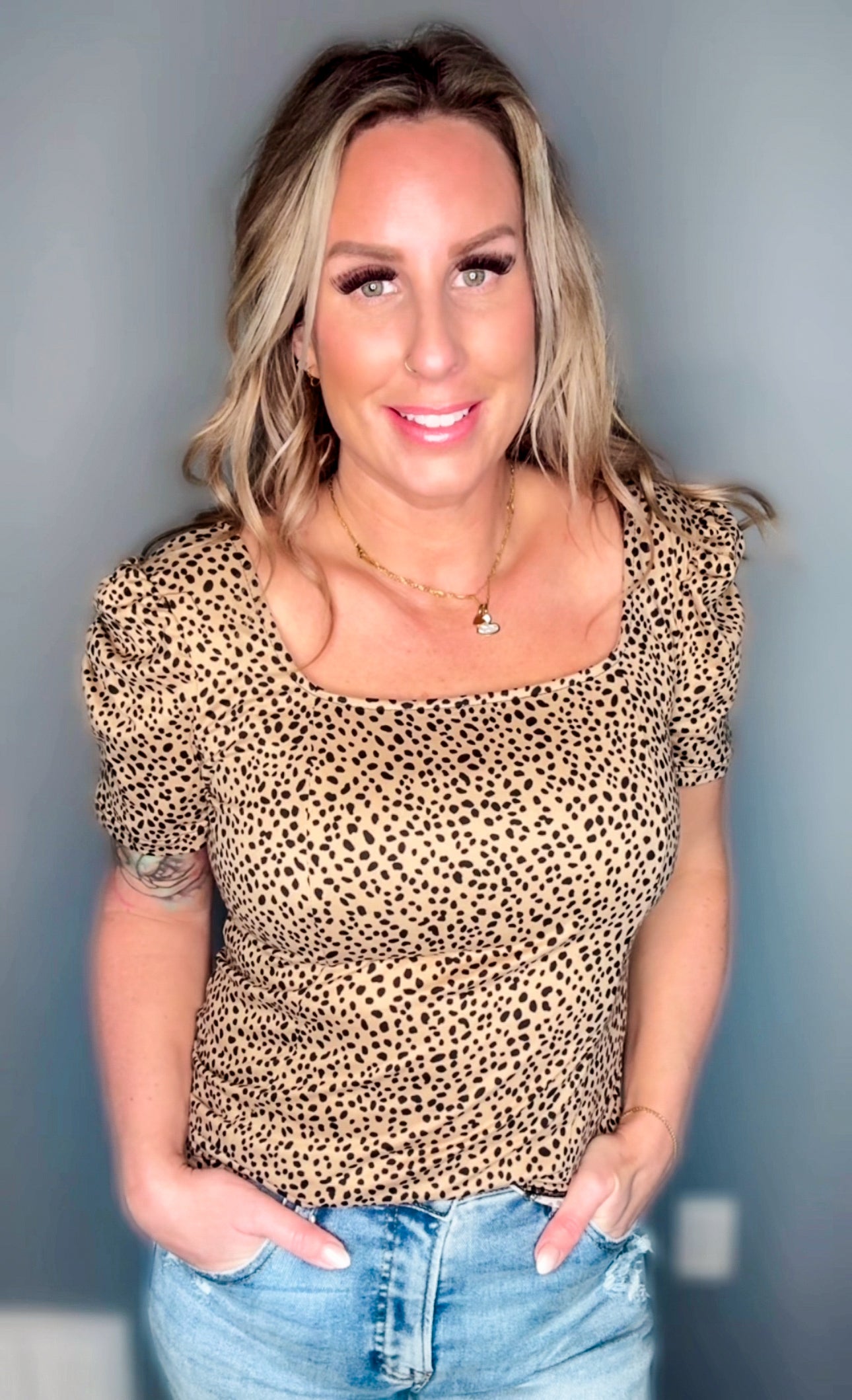 - Pullover short-sleeved leopard print top